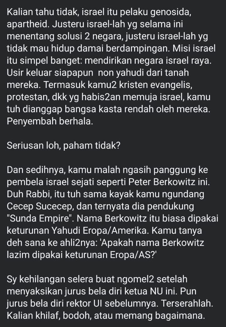 Dan sedihnya, kamu malah ngasih panggung ke pembela israel sejati seperti Peter Berkowitz ini. Duh Rabbi, itu tuh sama kayak kamu ngundang Cecep Sucecep, dan ternyata dia pendukung “Sunda Empire”. Nama Berkowitz itu biasa dipakai keturunan Yahudi Eropa/Amerika. Kamu tanya deh sana ke ahli2nya: ‘Apakah nama Berkowitz lazim dipakai keturunan Eropa/AS?’