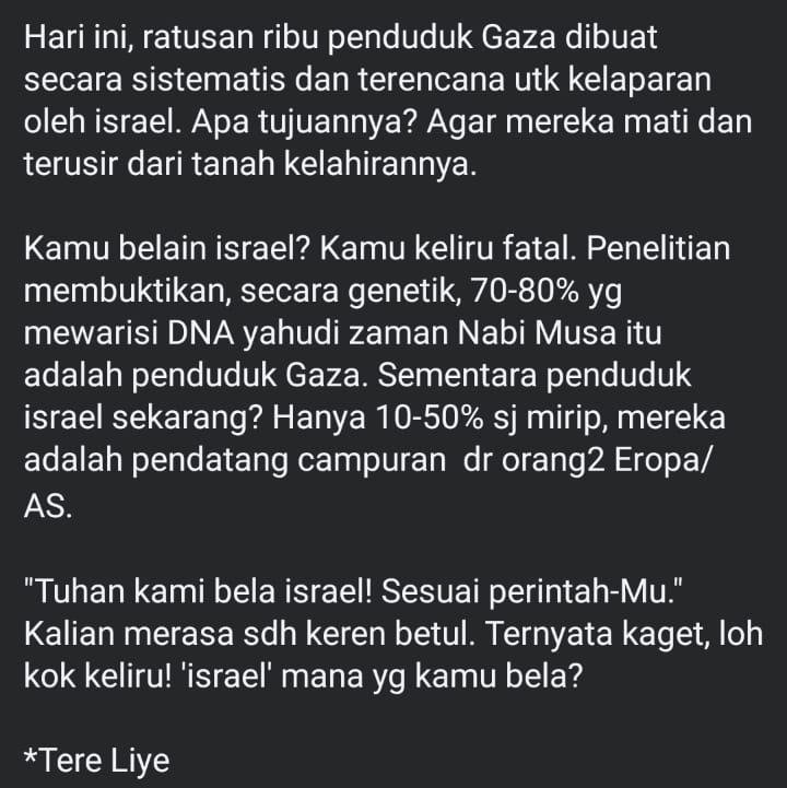 Hari ini, ratusan ribu penduduk Gaza dibuat secara sistematis dan terencana utk kelaparan oleh israel. Apa tujuannya? Agar mereka mati dan terusir dari tanah kelahirannya.