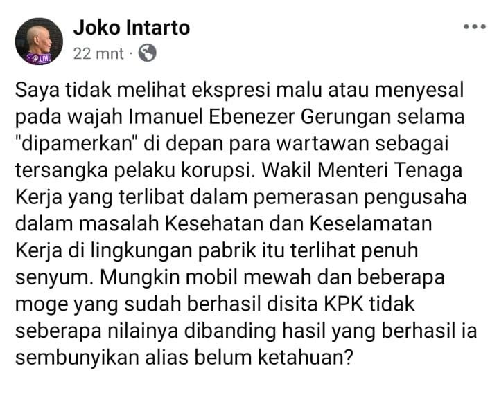 Saya tidak melihat ekspresi malu atau menyesal pada wajah Immanuel Ebenezer selama “dipamerkan” di depan para wartawan sebagai tersangka pelaku korupsi. Wakil Menteri Tenaga Kerja yang terlibat dalam pemerasan pengusaha dalam masalah Kesehatan dan Keselamatan Kerja di lingkungan pabrik itu terlihat penuh senyum. Mungkin mobil mewah dan beberapa moge yang sudah berhasil disita KPK tidak seberapa nilainya dibanding hasil yang berhasil ia sembunyikan alias belum ketahuan?