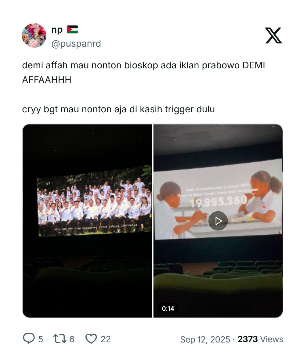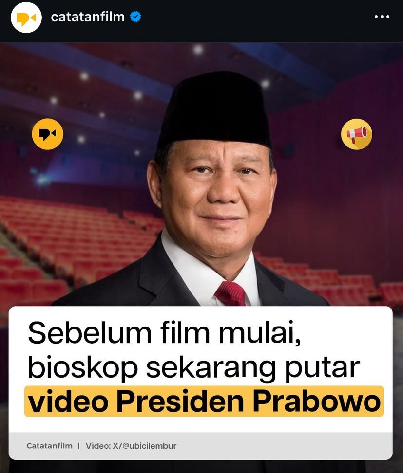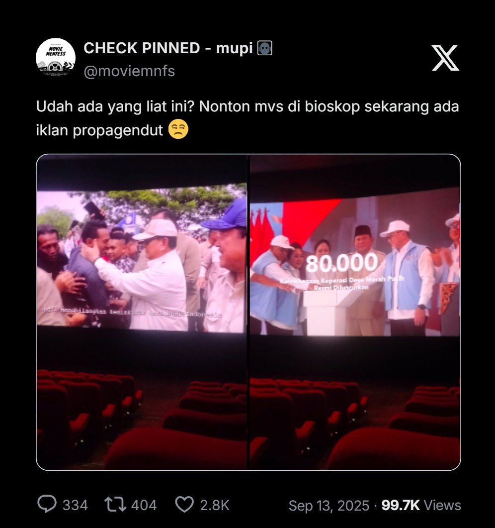Sebuah video yang menampilkan program dan aktivitas Presiden Prabowo Subianto yang ditayangkan sebelum pemutaran film di bioskop menjadi viral di media sosial. Tayangan ini memicu komentar negatif dari pecinta film.
