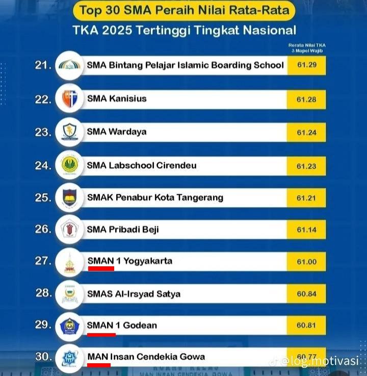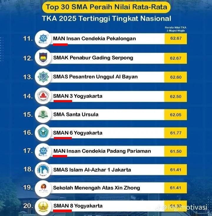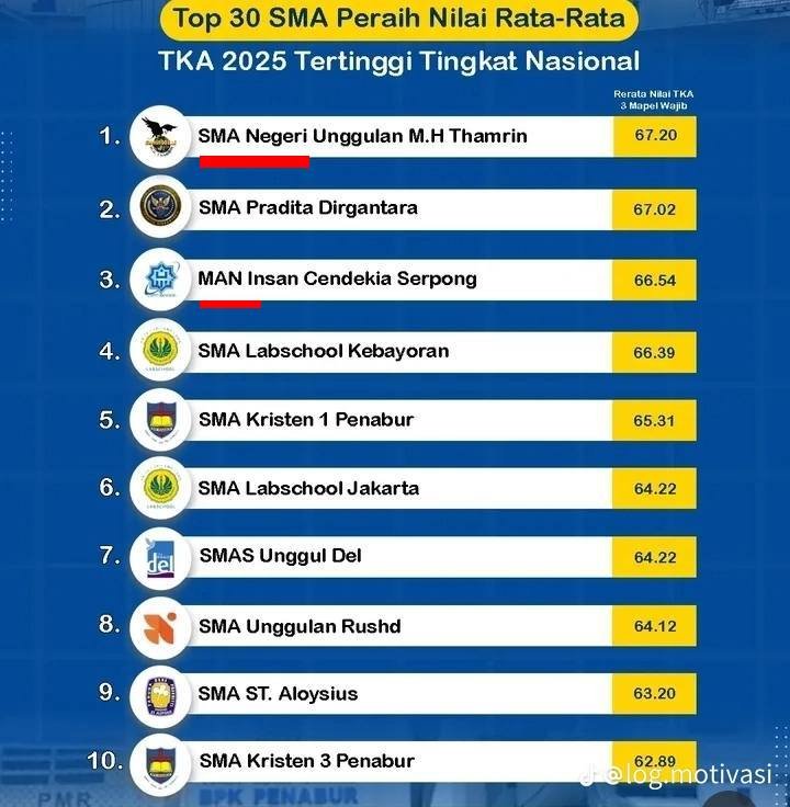 Berikut adalah SMA dengan nilai TKA rata-rata tertinggi di Indonesia