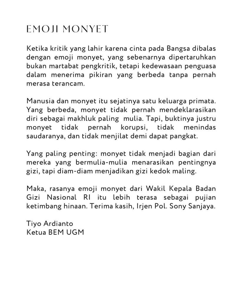 Menanggapi emoji monyet dari Wakil Kepala BGN Irjen Pol. Sony Sonjaya, Tiyo Ardianto Ketua Badan Eksekutif Mahasiswa Universitas Gadjah Mada (BEM UGM) memberi tanggapan menohok: