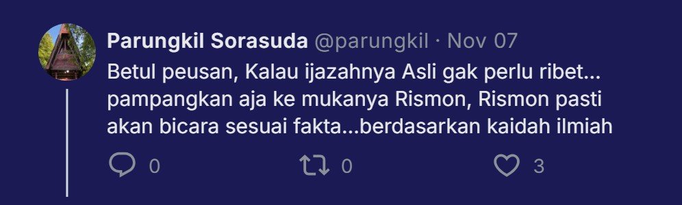 Kalau ijazahnya Asli gak perlu ribet…pampangkan aja ke mukanya Rismon, Rismon pasti akan bicara sesuai fakta…berdasarkan kaidah ilmiah.