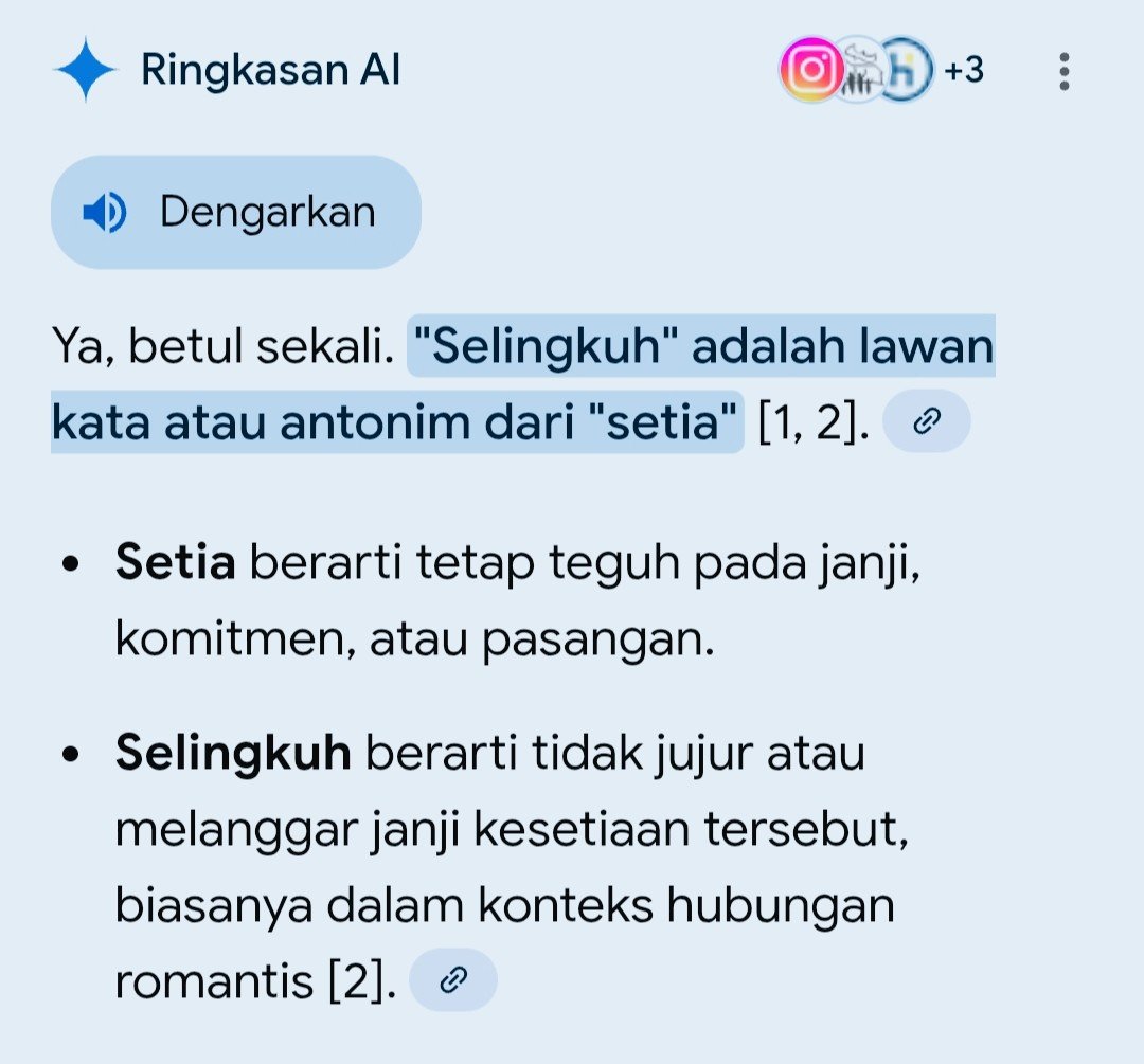 Di sini, kita tambahkan lagi, bahwa kata “selingkuh” itu biasanya menjadi lawan dari kata “setia” (lihat Ringkasan AI Google di bawah ini).