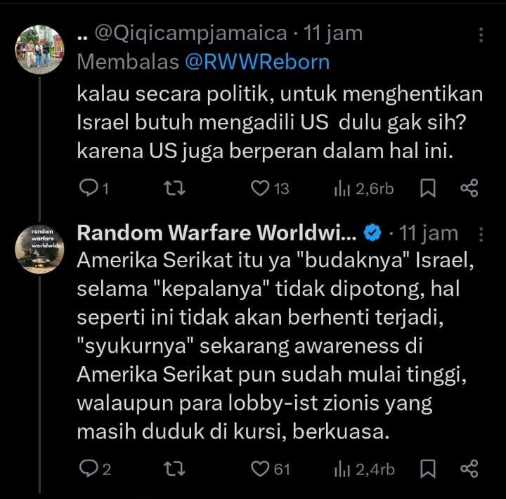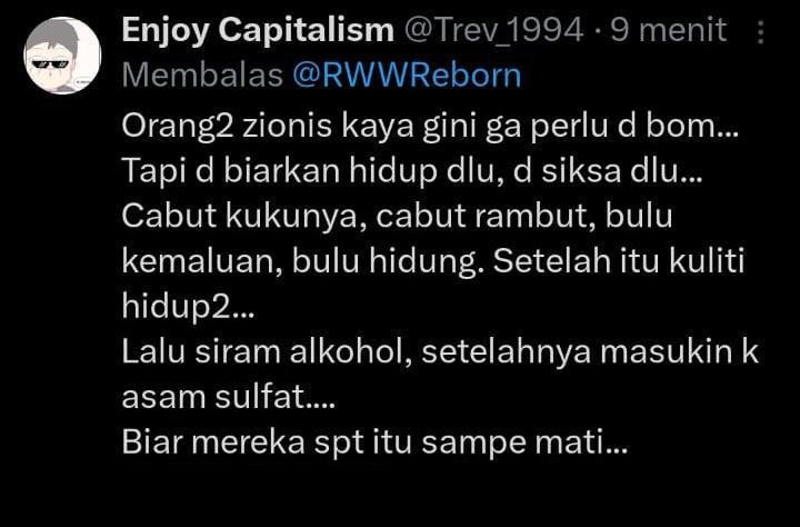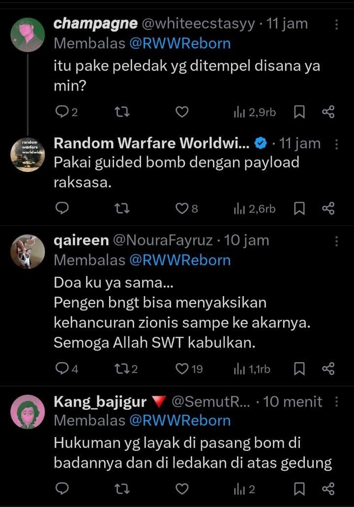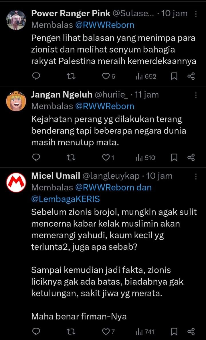 “Semoga saya cukup umur untuk menyaksikan secara langsung para politisi dan pemimpin zionis dieksekusi di hadapan publik… Keputusan yang mereka ambil, kebijakan mereka, benar-benar merenggut “kehidupan” jutaan orang, dari banyak suku, beragam agama, dan latar belakang budaya,” ujar akun X @RWWReborn.