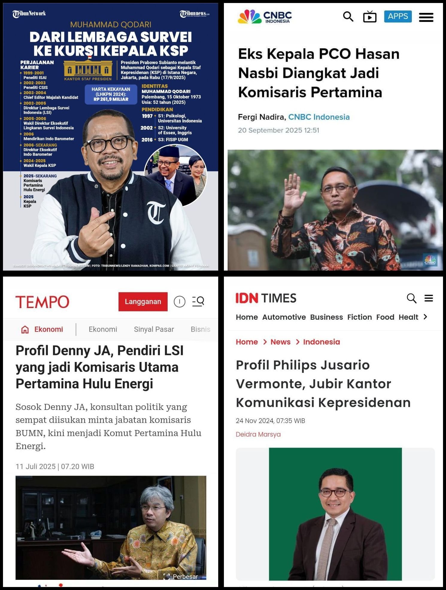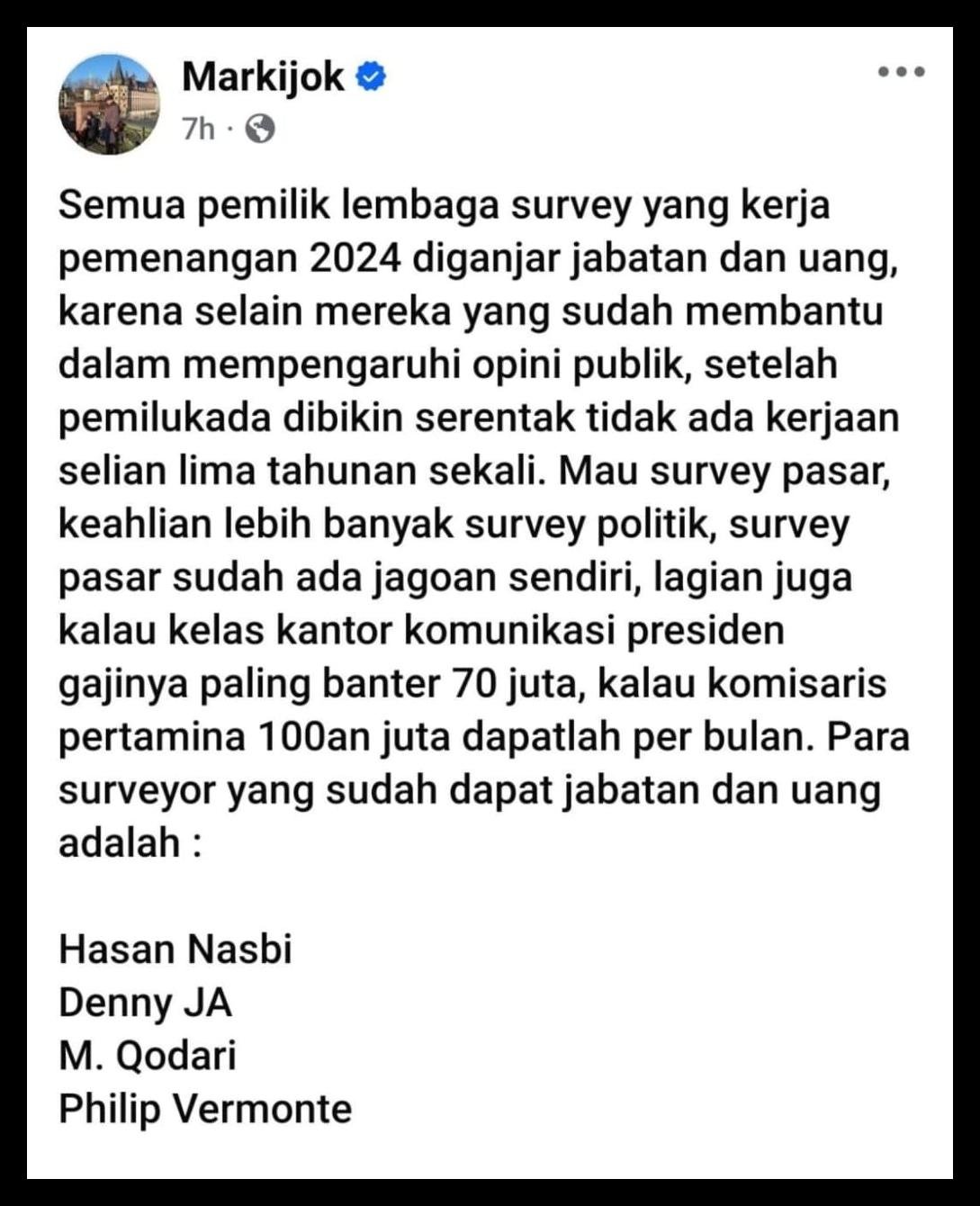 Semua pemilik lembaga survey yang kerja pemenangan 2024 diganjar jabatan dan uang, karena selain mereka yang sudah membantu dalam mempengaruhi opini publik, setelah pemilukada dibikin serentak tidak ada kerjaan selain lima tahunan sekali. Mau survey pasar, keahlian lebih banyak survey politik, survey pasar sudah ada jagoan sendiri, lagian juga kalau kelas kantor komunikasi presiden gajinya paling banter 70 juta, kalau komisaris pertamina 100an juta dapatlah per bulan. Para surveyor yang sudah dapat jabatan dan uang adalah :