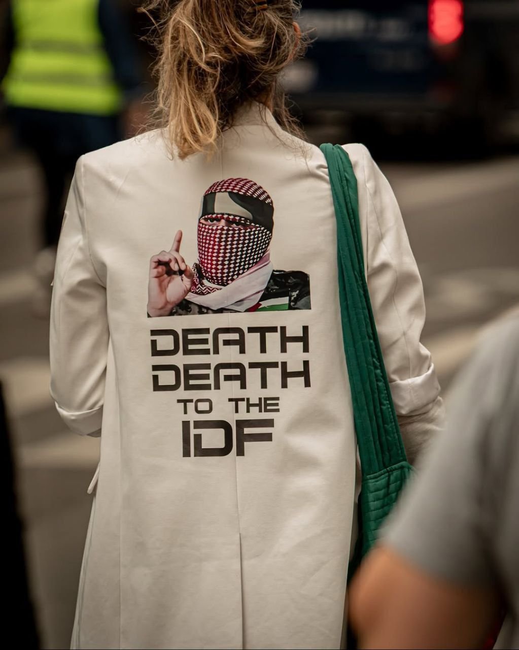 ⚡️ Seorang perempuan muda terlihat berjalan di jalanan Denmark mengenakan mantel bergambar JUBIR Al QASSAM ABU UBAIDAH dan slogan: “Matilah IDF”. (IDF = Tentara Israel)