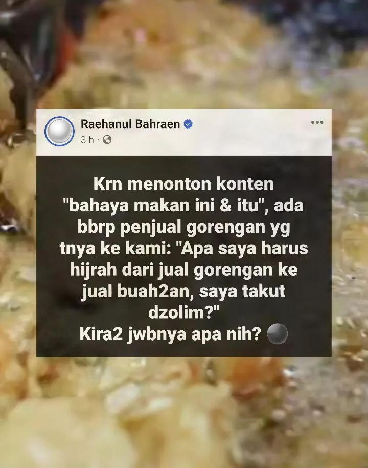 - Hendaknya tidak anti dan terlalu takut makan gorengan, boleh saja asalkan tidak tiap hari dalam jumlah besar, sesekali dan lebih baik lagi gorengan rumah dengan minyak yang tidak berkali-kali dipakai menggoreng.