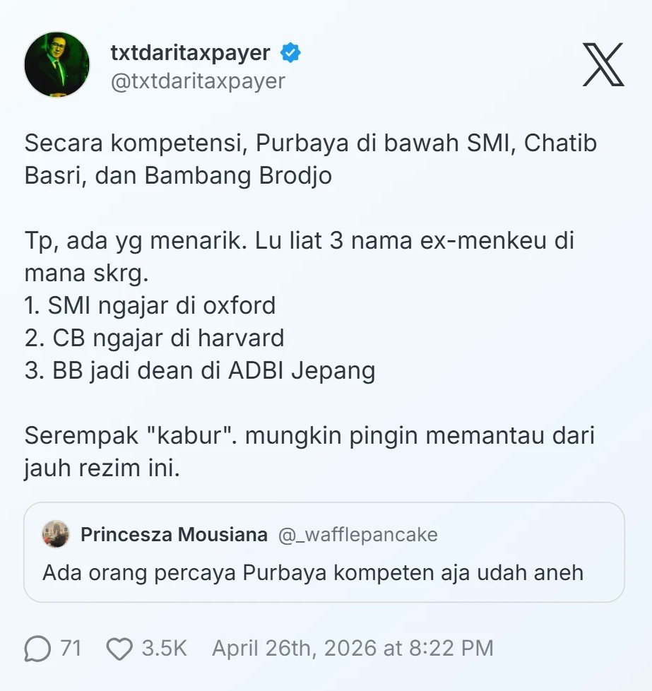 Secara kompetensi, Purbaya di bawah SMI (Sri Mulyani), Chatib Basri, dan Bambang Brodjo