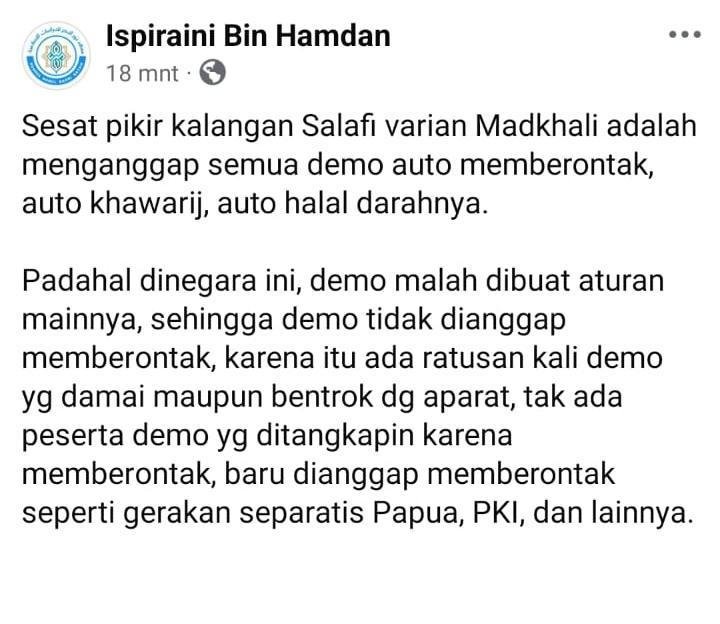 Sesat pikir kalangan Salafi varian Madkhali adalah menganggap semua demo auto memberontak, auto khawarij, auto halal darahnya.