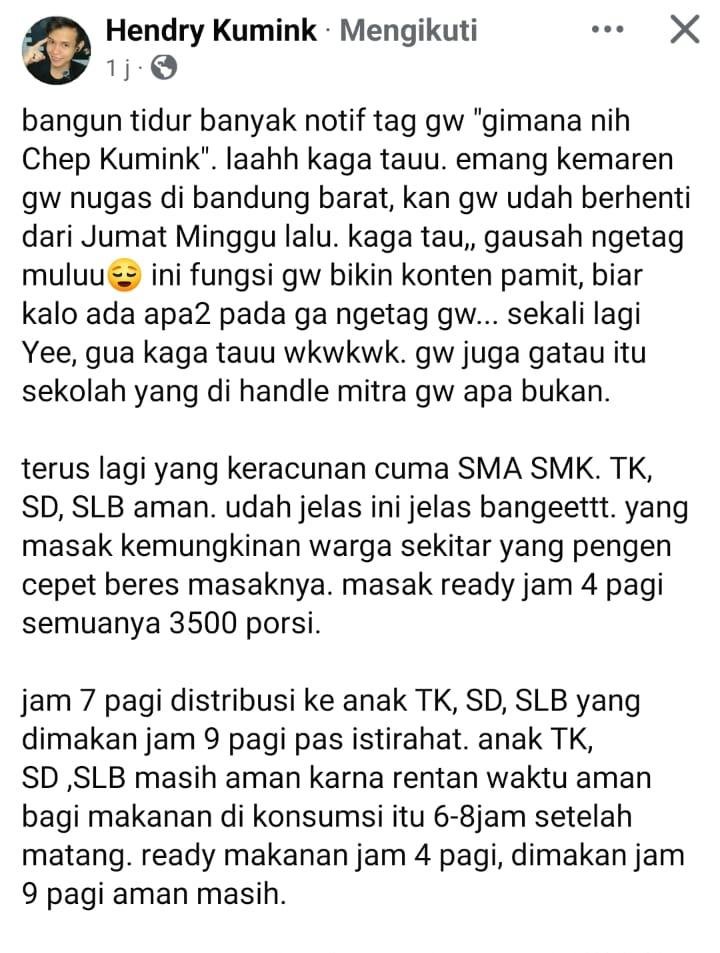 terus lagi yang keracunan cuma SMA SMK. TK, SD, SLB aman. udah jelas ini jelas bangeettt. yang masak kemungkinan warga sekitar yang pengen cepet beres masaknya. masak ready jam 4 pagi semuanya 3500 porsi.
