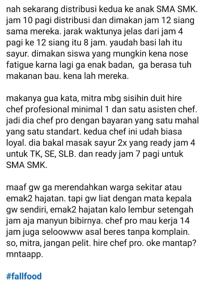 makanya gua kata, mitra mbg sisihin duit hire chef profesional minimal 1 dan satu asisten chef. jadi dia chef pro dengan bayaran yang satu mahal yang satu standart. kedua chef ini udah biasa loyal. dia bakal masak sayur 2x yang ready jam 4 untuk TK, SE, SLB. dan ready jam 7 pagi untuk SMA SMK.