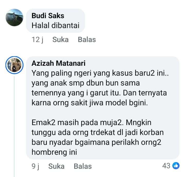 “Baru kita dikejutkan oleh penemuan jenazah siswa SMP yang dibunuh “temannya” karena tidak terima diputuskan hubungannya, sekarang idola para boti ini akan tour keliling kota. Wal’iyadzubillah. Mulai saat ini stop normalisasi memberikan panggung untuk para boti, walau untuk hiburan dll. Bahayanya sudah sangat meresahkan dan mengundang murka Allah. Kapan sih Indonesia bisa meniru Rusia melarang eljibiti?!”
