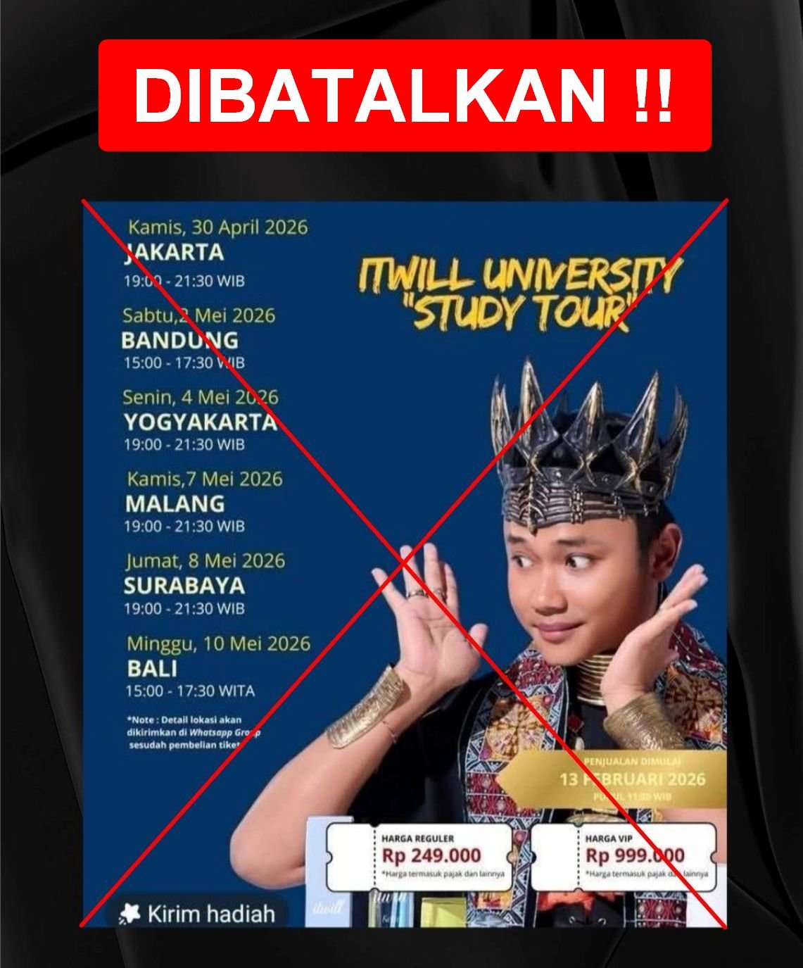 Dalam konten terbaru yang diunggah pada Selasa (17/2/2026), Itwill memastikan, acara University Study Tour yang harusnya digelar mulai 30 April di Jakarta, batal.