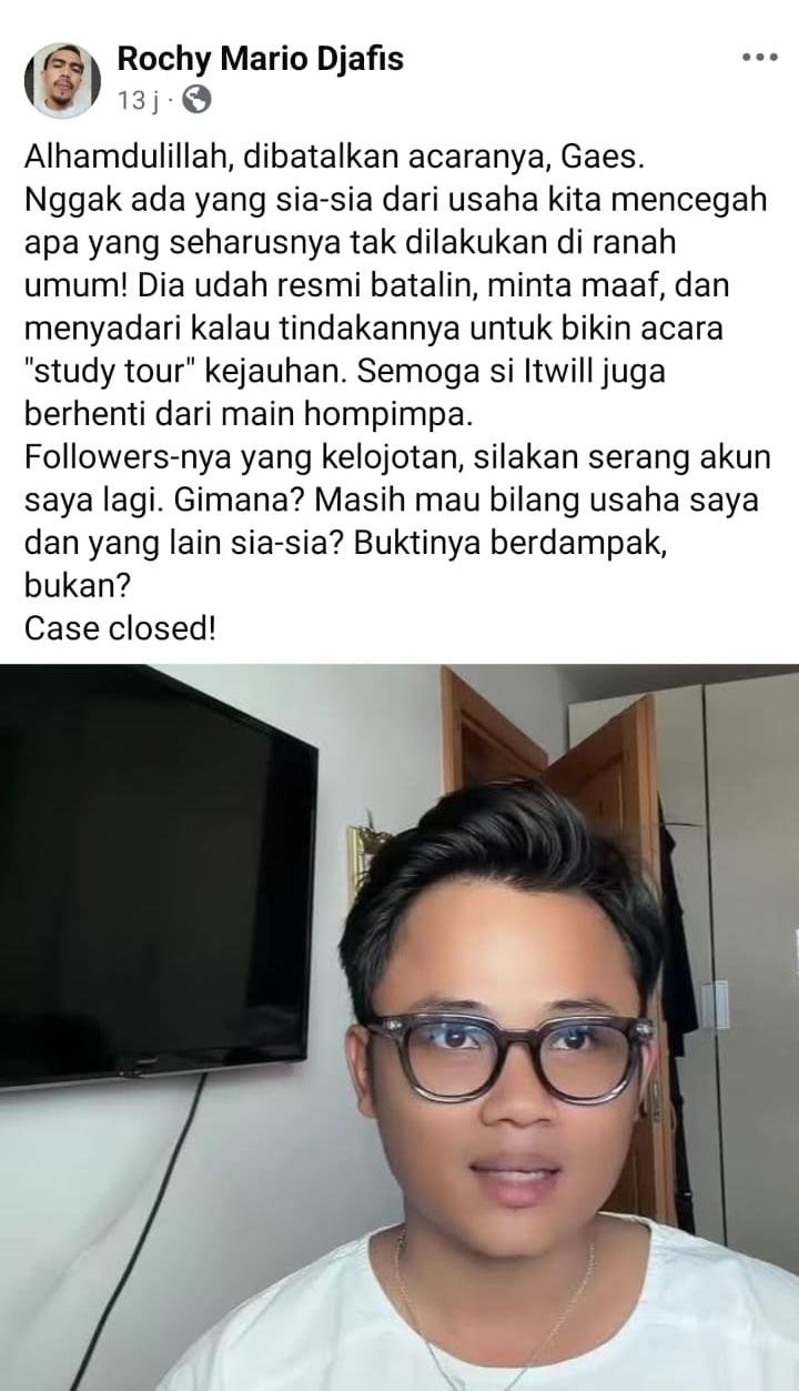 SETELAH MENUAI KECAMAN DAN PENOLAKAN LUAS SERTA ANCAMAN BAKAL DIGERUDUK, konten kreator yang bernama Kak Itwill yang dikenal ‘melambai’ akhirnya membatalkan acara jumpa fans (meet and greet serta QnA) yang bertajuk Universtiy Study Tour.