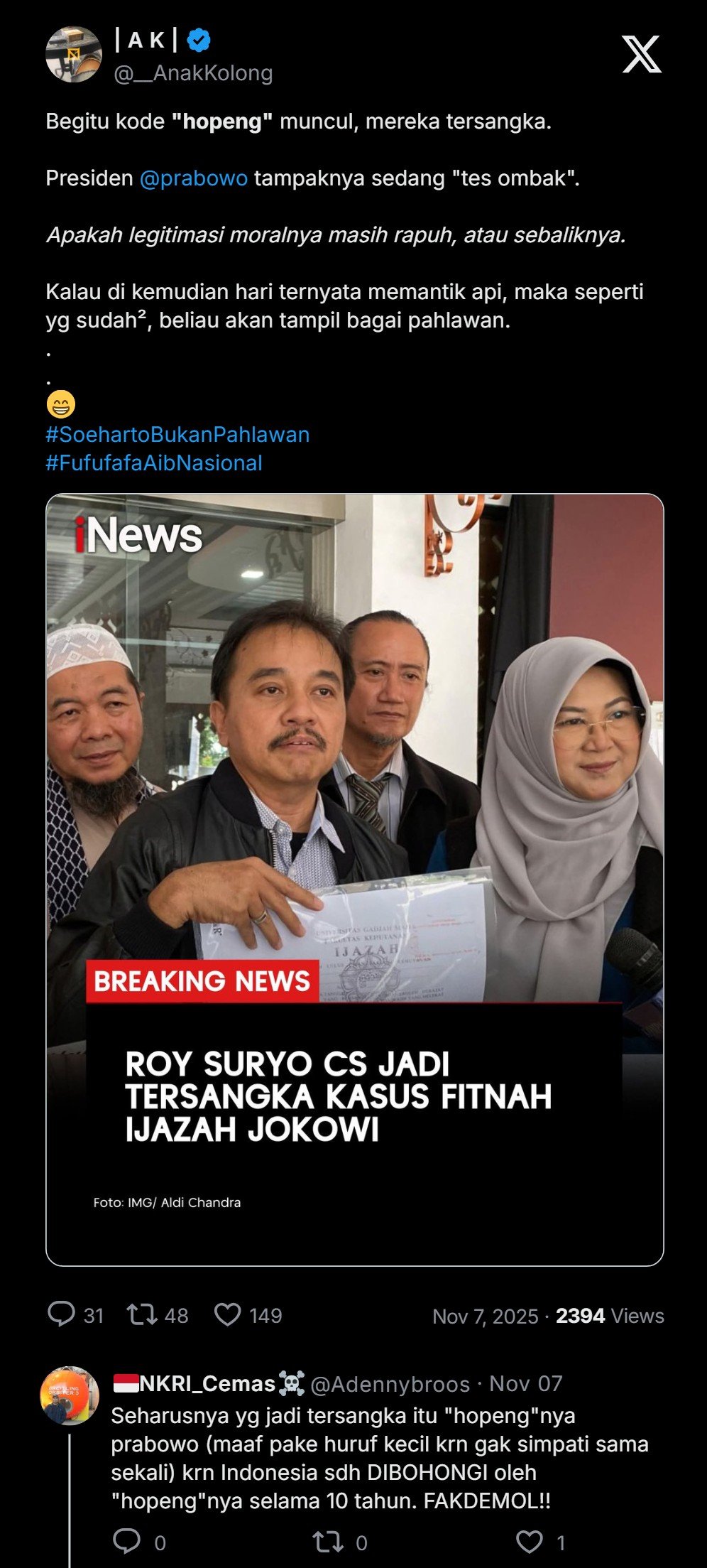 Dan hari ini, Jumat 7 November 2025, Polisi menetapkan 8 orang Roy Suryo cs sebagai tersangka kasus pencemaran nama baik Jokowi terkait tuduhan ijazah palsu. Padahal ijazah aslinya belum terbukti.