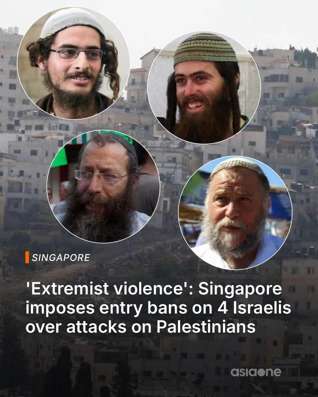 Meir Mordechai Ettinger, Elisha Yered, Ben-Zion Gopstein, dan Baruch Marzel “telah terlibat dalam tindakan ekstremis yang sangat serius terhadap warga Palestina di Tepi Barat,” kata Kementerian Luar Negeri Singapura dalam sebuah pernyataan.