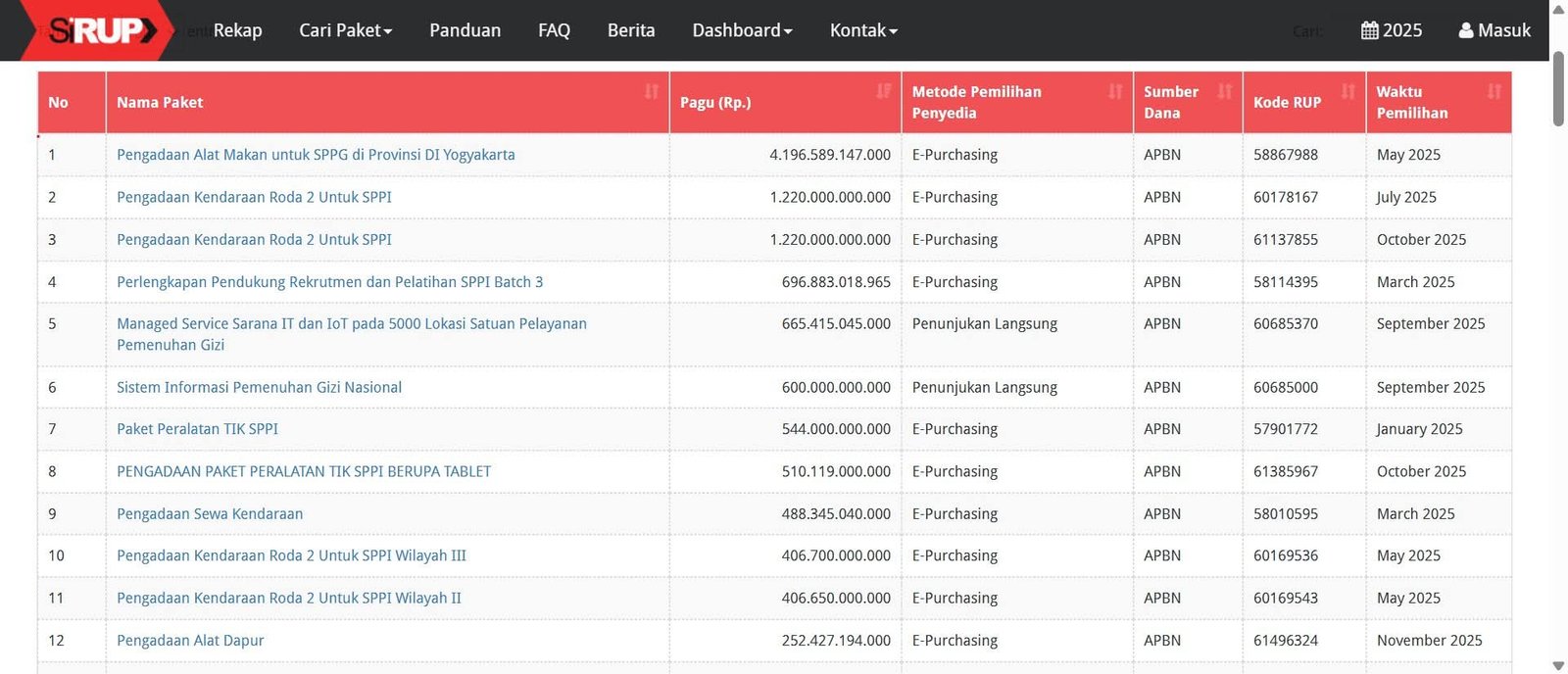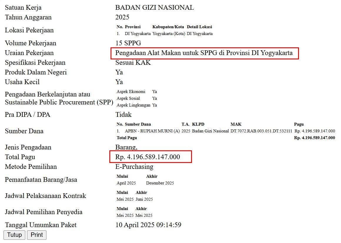 Tahun 2025, laman SiRUP LKPP (Sistem Informasi Rencana Umum Pengadaan Lembaga Kebijakan Pengadaan Barang/Jasa Pemerintah) mencatat alokasi terbesar: Rp4,19 triliun untuk pengadaan alat makan bagi SPPG di Provinsi DI Yogyakarta. Total anggaran MBG/BGN 2025 adalah Rp71 triliun. Berarti, 6% habis hanya untuk alat makan di Yogyakarta (di luar paket pengadaan 17 juta sendok bebek senilai Rp102 miliar yang dilakukan terpisah).