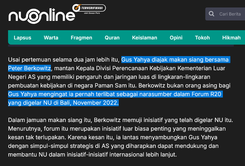 Dalam artikel “Melawat Ke Amerika Serikat, Gus Yahya Perkenalkan Gagasan NU Soal Peradaban”, dituliskan: “Berkowitz bukan orang asing bagi Gus Yahya mengingat ia pernah terlibat sebagai narasumber dalam Forum R20 yang digelar NU di Bali, November 2022”.