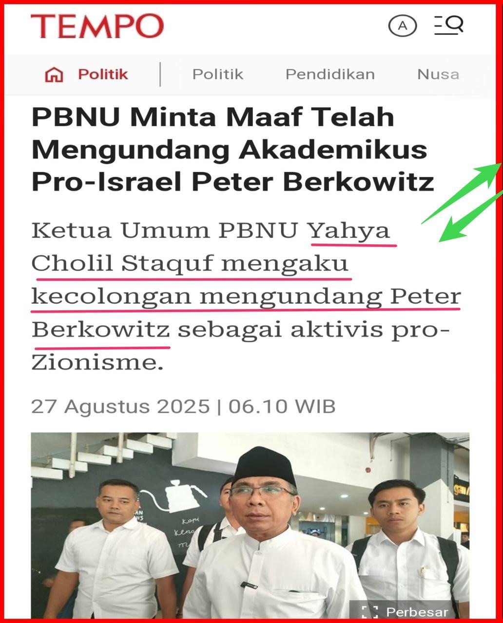 Ketum PBNU Yahya Cholil Staquf minta maaf telah mengundang Akademisi Pro-ISRAEL Peter Berkowitz.