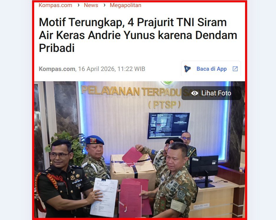 Motif Terungkap, 4 Prajurit TNI Siram Air Keras Andrie Yunus karena Dendam Pribadi