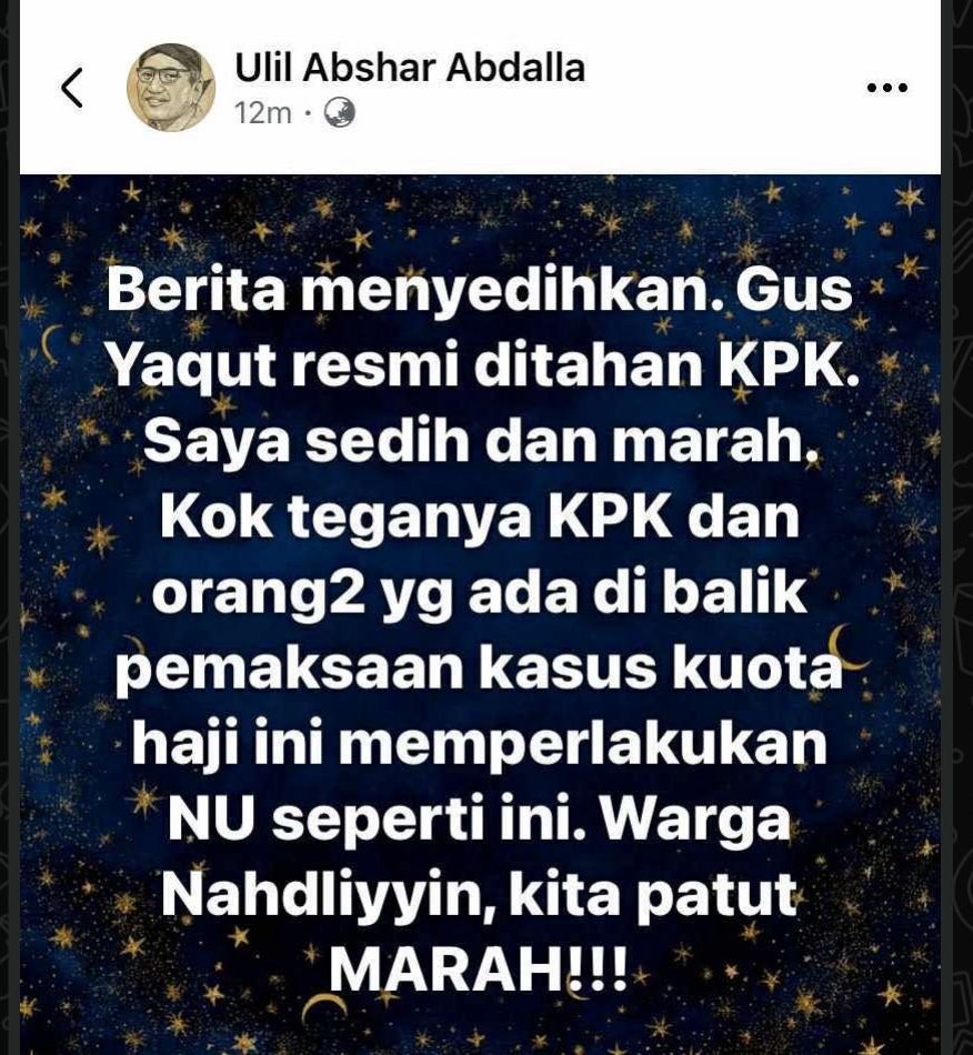 Berita menyedihkan. Gus Yaqut resmi ditahan KPK. Saya sedih dan marah. Kok teganya KPK dan orang2 yg ada di balik pemaksaan kasus kuota haji ini memperlakukan NU seperti ini. Warga Nahdliyyin, kita patut MARAH!!!