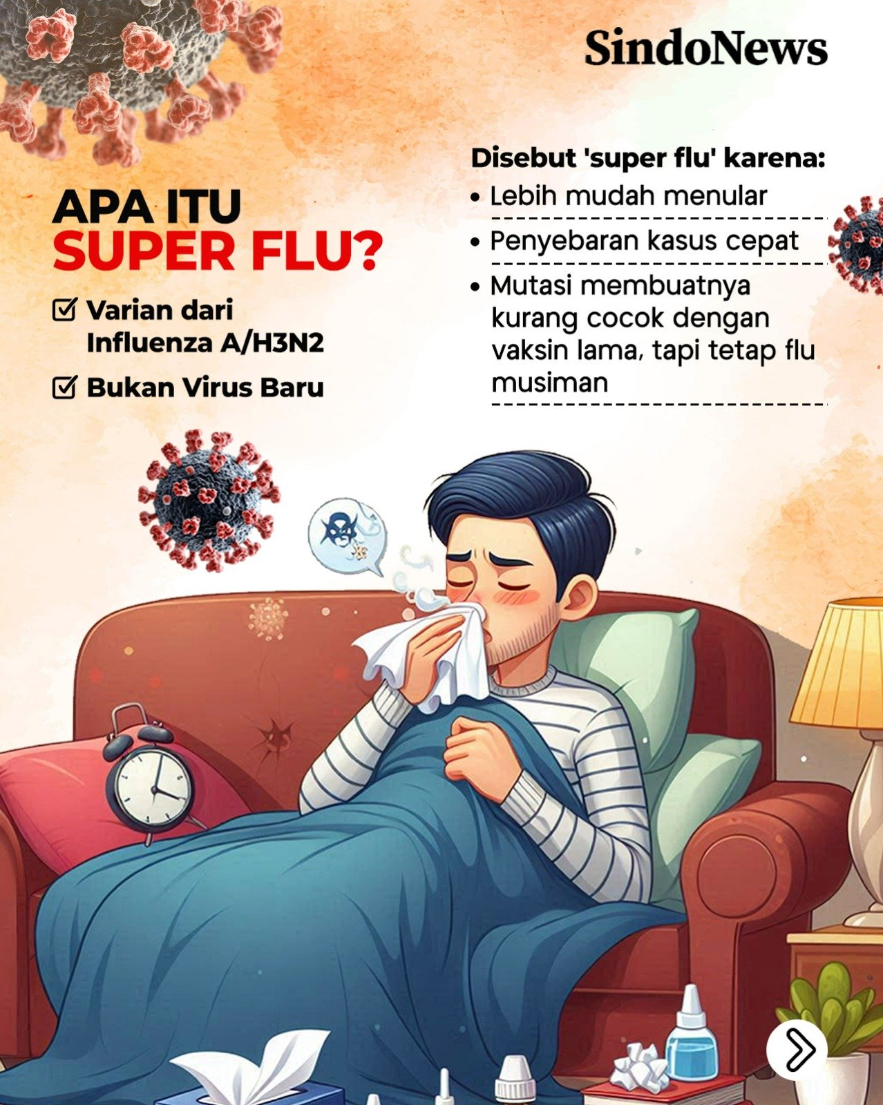 “Super Flu” adalah istilah populer untuk varian baru virus Influenza A (H3N2) subklade K yang mulai ramai diberitakan masuk ke Indonesia pada akhir Desember 2025 dan awal Januari 2026.