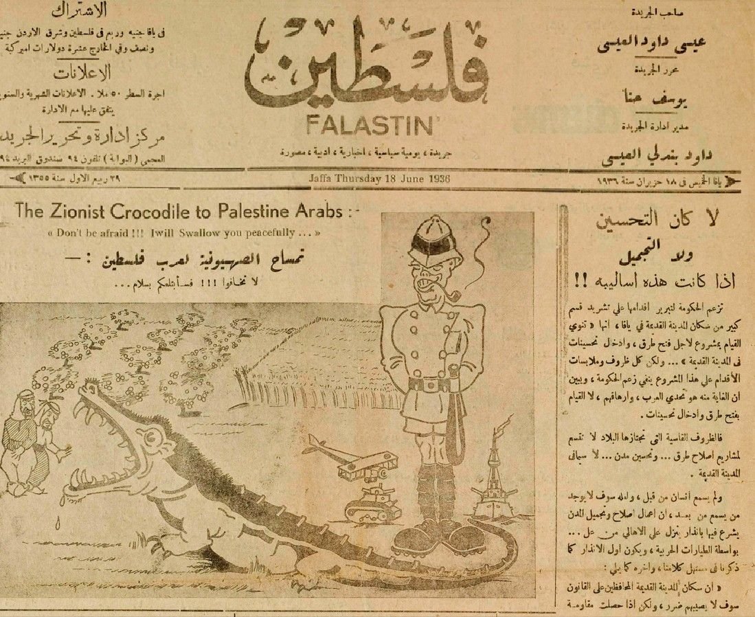 Surat kabar Arab-Kristen Palestina, FALASTIN, dalam edisi 18 Juni 1936, memuat karikatur yang menggambarkan Zionisme sebagai seekor buaya di bawah perlindungan seorang perwira Inggris. Buaya itu menyapa orang-orang Arab Palestina dengan kalimat: