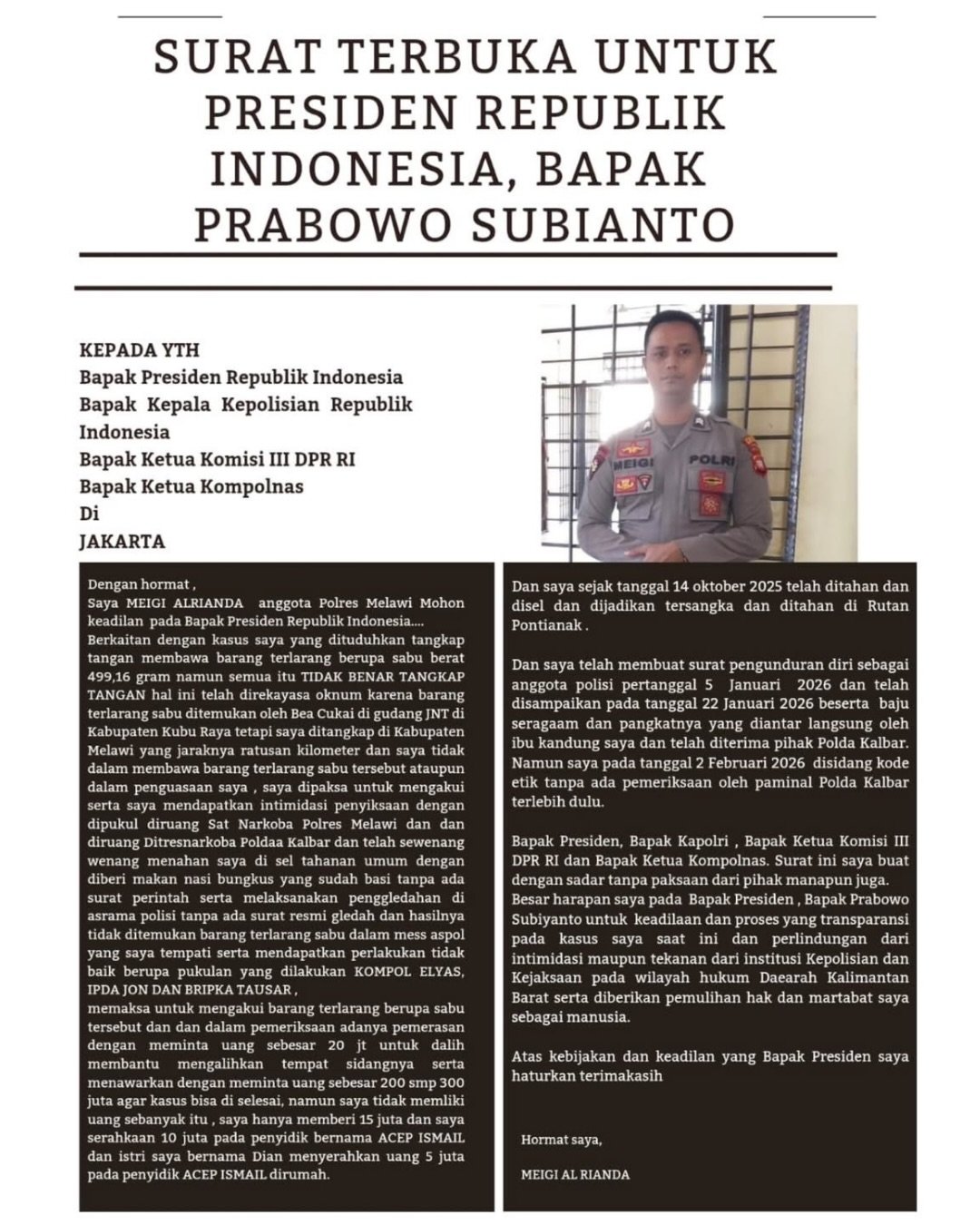 Meigi, yang mengundurkan diri pada 5 Januari 2026, menumpahkan seluruh pengalamannya dalam sepucuk surat. Ia mengaku menjadi korban rekayasa kasus narkoba—dituduh membawa 499,16 gram sabu dalam sebuah operasi tangkap tangan yang ia klaim tidak pernah terjadi. Menurutnya, barang bukti itu ditemukan di gudang Bea Cukai di Kubu Raya, ratusan kilometer dari lokasi penangkapannya di Melawi. Ia tidak memegang, memiliki, atau menguasainya.