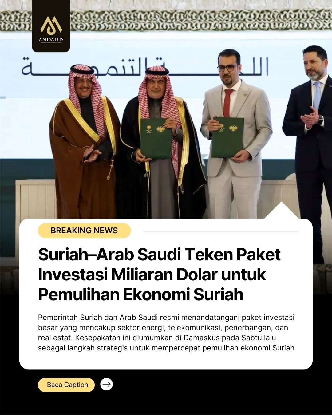 Pemerintah Suriah dan Arab Saudi resmi menandatangani paket investasi besar yang mencakup sektor energi, telekomunikasi, penerbangan, dan real estat. Kesepakatan ini diumumkan di Damaskus pada Sabtu lalu (7/2/2026) untuk mempercepat pemulihan ekonomi Suriah.