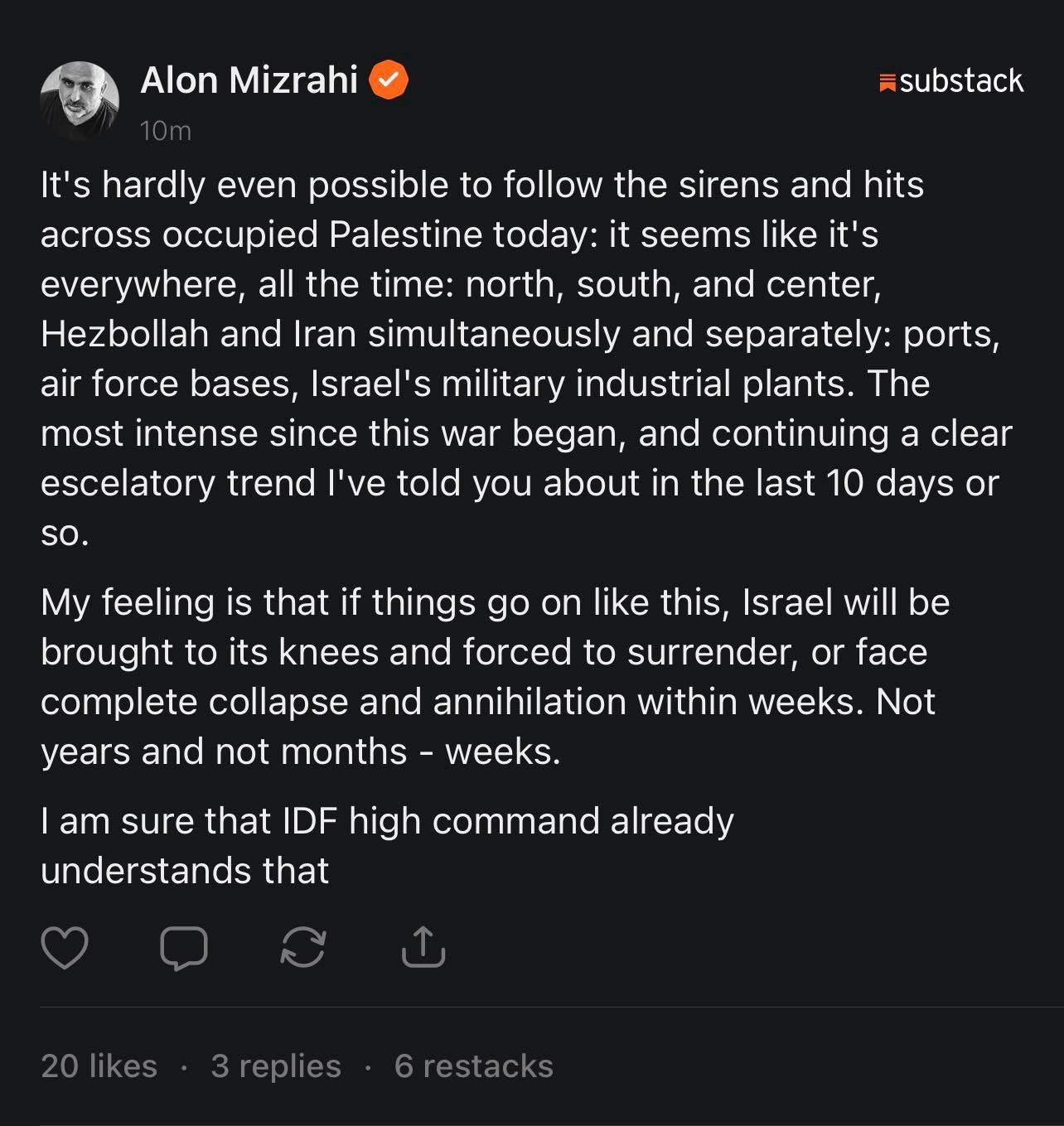 Sepuluh menit yang lalu, saya membaca postingan jurnalis Israel yang sangat kritis pada pemerintahan Netanyahu saat ini, Alon Mizrahi, di akun Substacknya. Saya tangkap unggahan Mizrahi itu seperti di bawah ini. Mengkonfirmasi beberapa laporan yang saya baca semalam.