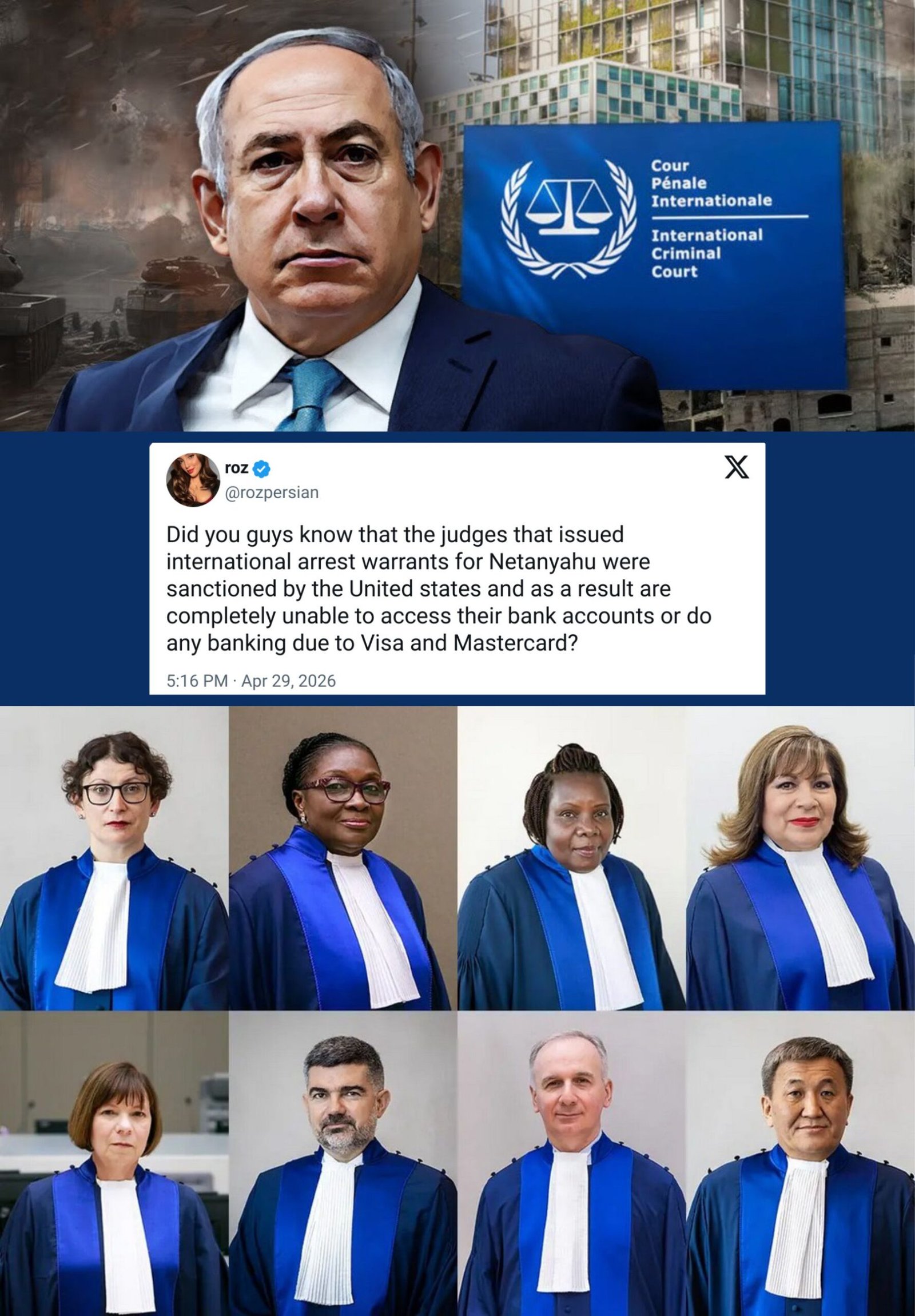 Tahukah kalian bahwa para hakim ICC yang mengeluarkan surat perintah penangkapan untuk Netanyahu dikenai sanksi oleh Amerika Serikat dan akibatnya sama sekali tidak dapat mengakses rekening bank mereka atau melakukan transaksi perbankan apa pun melalui Visa dan Mastercard?