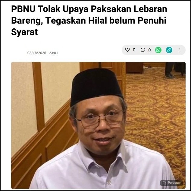 👉🏻 Menurut kriteria rukyah NU, sama dengan kriteria MABIMS dimana hilal nanti malam belum memenuhi kriteria untuk bisa dilihat, sehingga Idul Fitri Sabtu 21 Maret 2026. NU memperingatkan pemerintah RI untuk tidak “memaksakan” Idul Fitri pada Jumat 20 Maret 2026 hanya untuk “menyamakan” dengan Muhammadiyah agar Lebarannya sama.