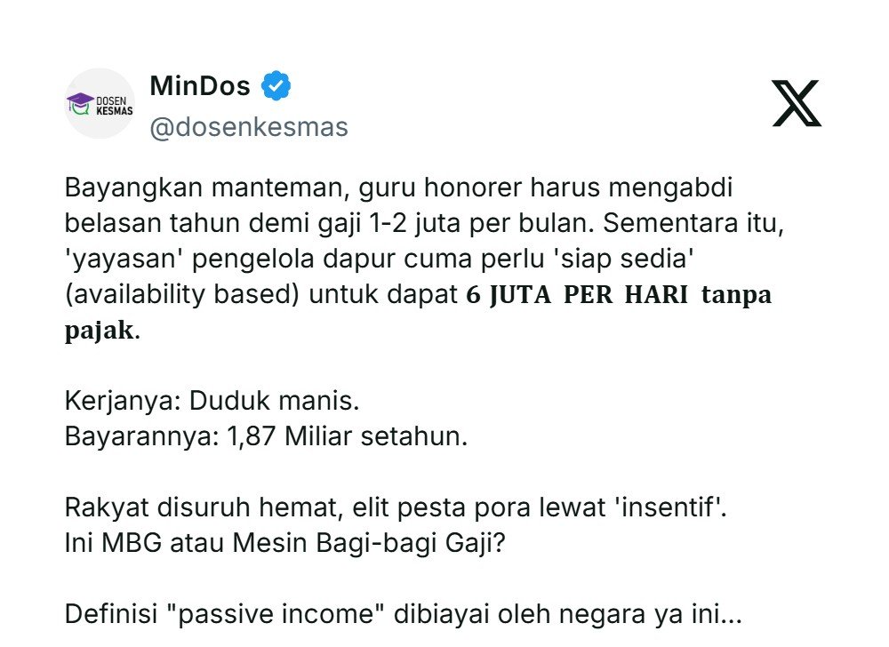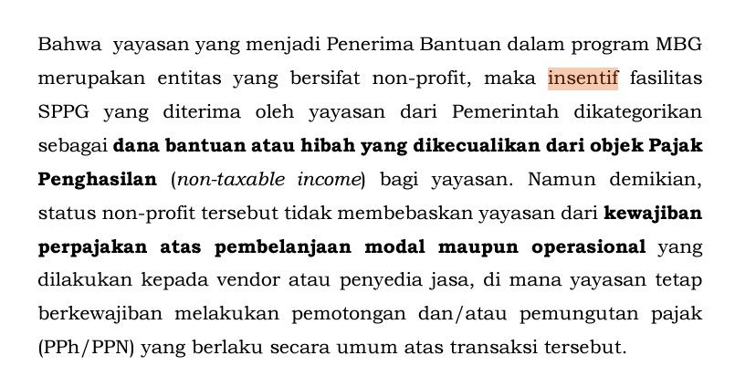 Tidak habis pikir. Petunjuk teknis terbaru menunjukkan YAYASAN pengelola MBG dapat insentif 6 JUTA PER HARI selama 313 hari, libur pun masih dapat. Insentif itu tanpa kena pajak.