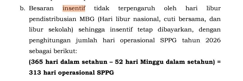 Dijelaskan bahwa insentif ini bukan berdasarkan output based (berlaku 2025) yaitu jumlah porsi yang diberikan, tapi malahan availability based yaitu asal sudah ada dapur meski belum beroperasi. Jelas-jelas enak donk yang penyaluran porsinya sedikit bahkan belum kerja sudah dapat 6 JUTA PER HARI. Cukup duduk manis dukung rejim.