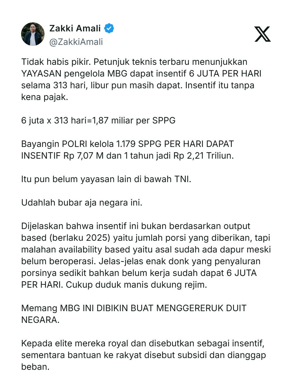 Tidak habis pikir. Petunjuk teknis terbaru menunjukkan YAYASAN pengelola MBG dapat insentif 6 JUTA PER HARI selama 313 hari, libur pun masih dapat. Insentif itu tanpa kena pajak.