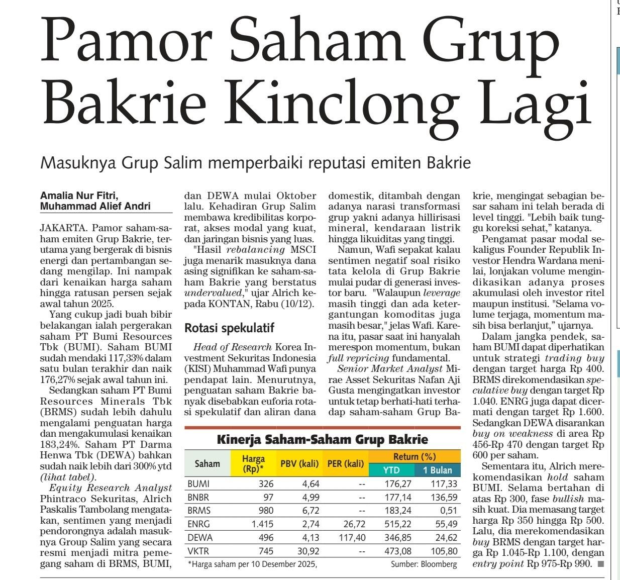 Kontan (11/12/2025) menulis “Pamor Saham Grup Bakrie Kinclong Lagi”. Masuknya Grup Salim disebut memperbaiki reputasi emiten Bakrie. Salah satunya PT Bumi Resources Minerals Tbk (BRMS) yang kenaikan harga sahamnya mencapai 183,24%. Kabar baik, bukan?