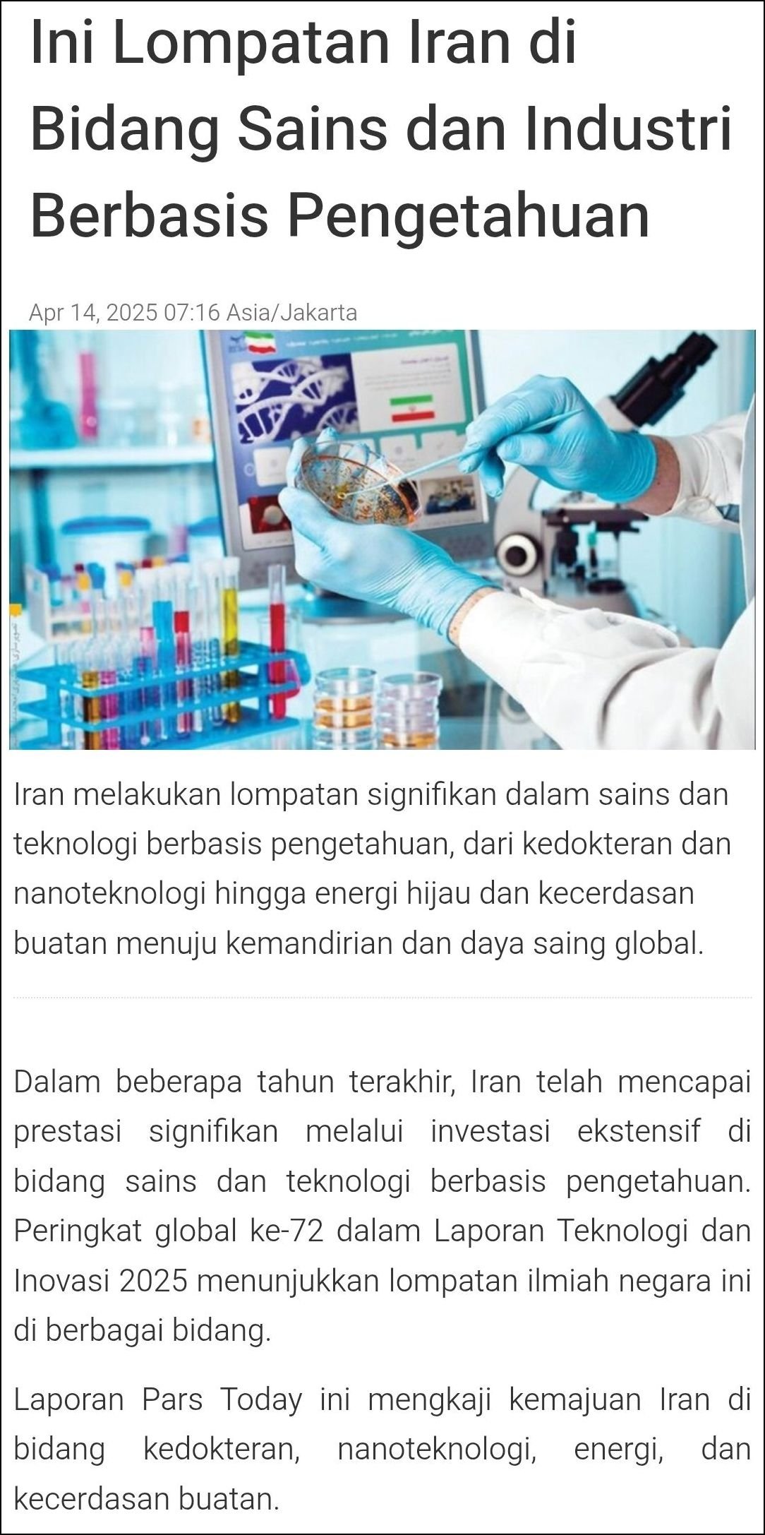 Padahal realitanya, Iran tidak hanya memproduksi roket, tapi juga maju dalam bidang nanotekhnologi, teknologi medisnya terdepan di kawasan, sains dan industrinya maju, bahkan di bidang energi, teknologi hijaunya menjadi rujukan dunia…