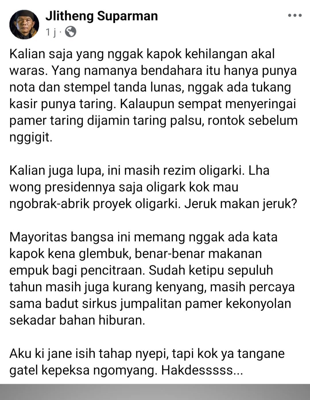 Kalian juga lupa, ini masih rezim oligarki. Lha wong presidennya saja oligark kok mau ngobrak-abrik proyek oligarki. Jeruk makan jeruk?