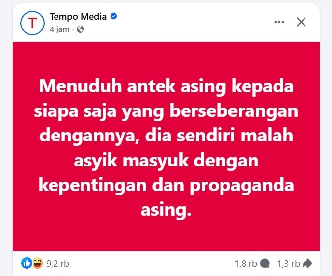 TEMPO: Menuduh antek asing kepada siapa saja yang berseberangan dengannya, dia sendiri malah asyik masyuk dengan kepentingan dan propaganda asing.