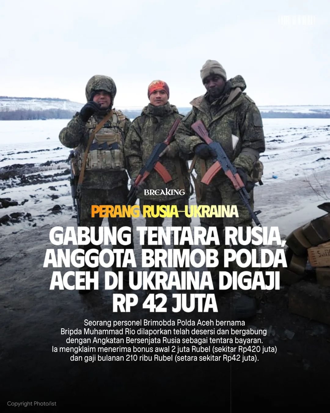Baru-baru ini seorang personel Brimob Polda Aceh, Bripda Muhammad Rio, nekat desersi dan bergabung dengan tentara bayaran Rusia. Ia mengaku mendapatkan pangkat Letda di militer Rusia dengan bonus awal bergabung sebesar 2 juta Rubel (sekitar Rp420 juta) dan gaji bulanan sekitar Rp42 juta.