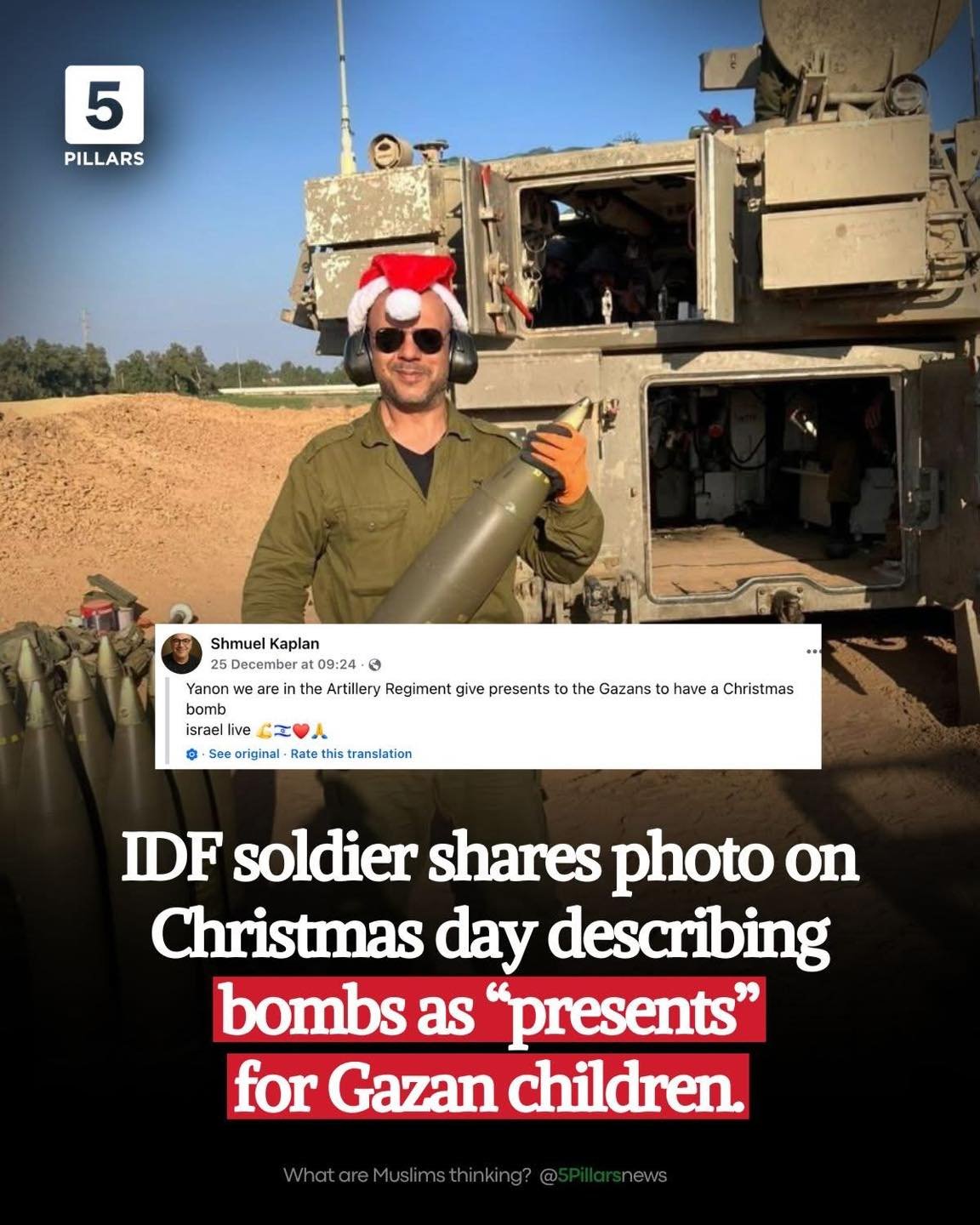 Seorang tentara IDF bernama Shmuel Kaplan membagikan foto dirinya dengan topi santa memegang peluru artileri, menyatakan, “kami di Resimen Artileri memberikan hadiah kepada warga Gaza berupa bom Natal”.