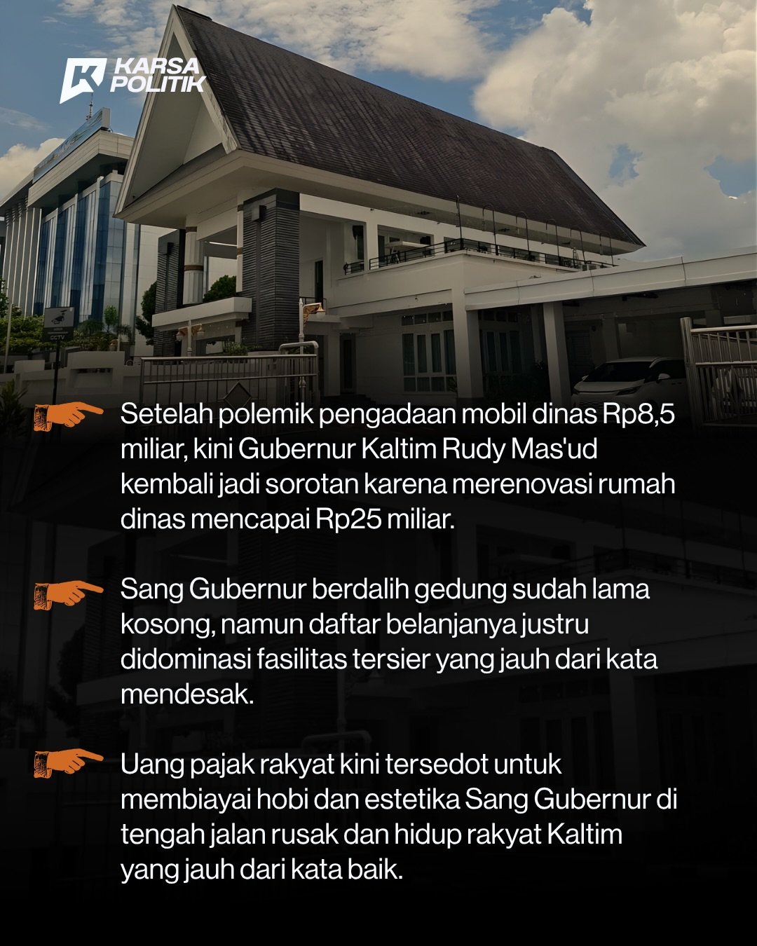 Setelah pengadaan mobil dinas Rp 8,5 miliar yang bikin heboh, kini Gubernur Kalimantan Timur (Kaltim) Rudy Mas’ud kembali jadi sorotan karen merenovasi rumah dinas mencapai Rp 25 miliar.