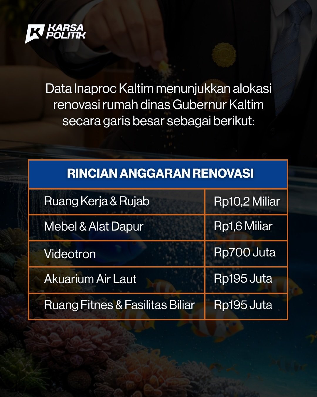 Salah satu item yang paling menyita perhatian adalah pengadaan akuarium air laut di rumah jabatan Gubernur dengan nilai mencapai Rp 195 juta.