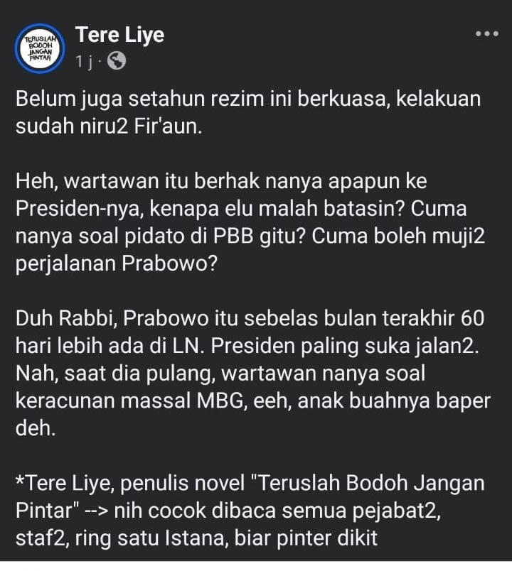 Heh, wartawan itu berhak nanya apapun ke Presiden-nya, kenapa elu malah batasin? Cuma nanya soal pidato di PBB gitu? Cuma boleh muji2 perjalanan Prabowo?