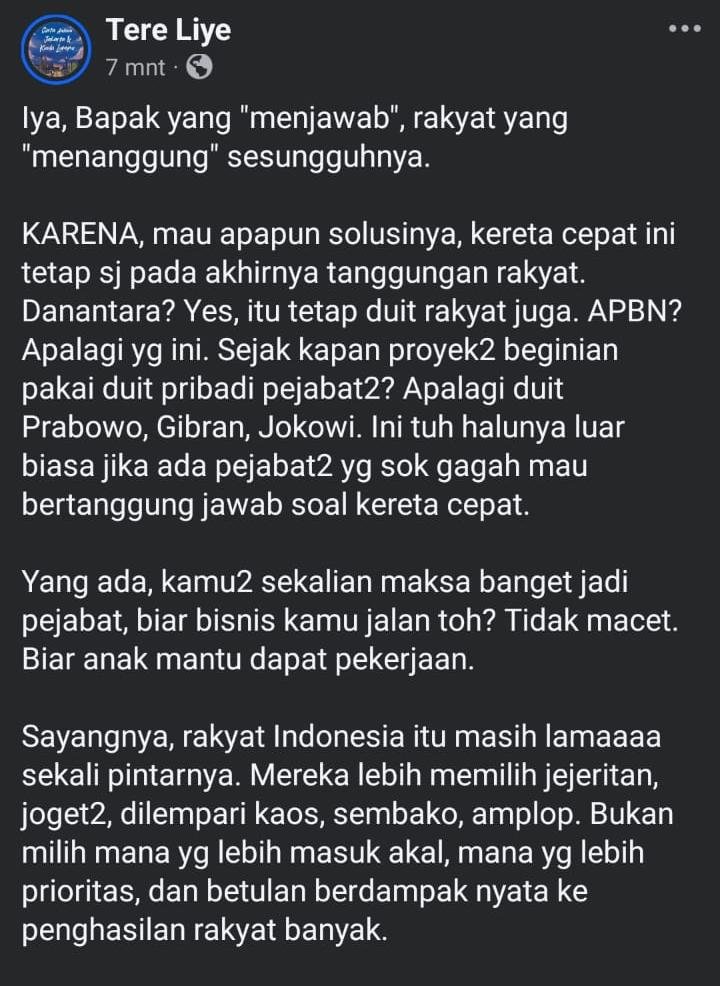 Ini tuh halunya luar biasa jika ada pejabat-pejabat yang sok gagah mau bertanggung jawab soal kereta cepat.