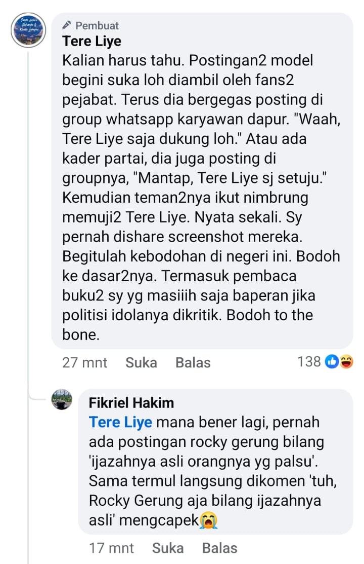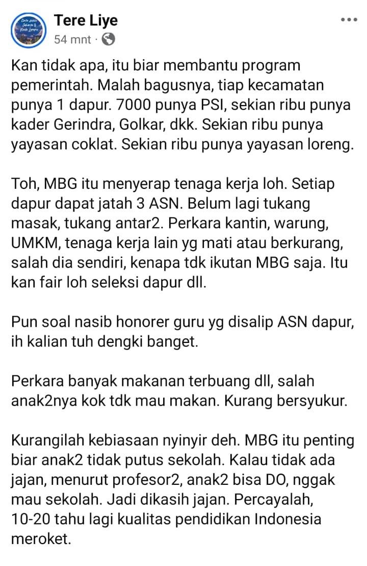 Tulisan satir Tere Liye yang oleh pendukung rezim malah diklaim sebagai dukungan Tere Liye. Mereka tidak mengerti satir mungkin kebanyakan makan MBG 🤣🤣