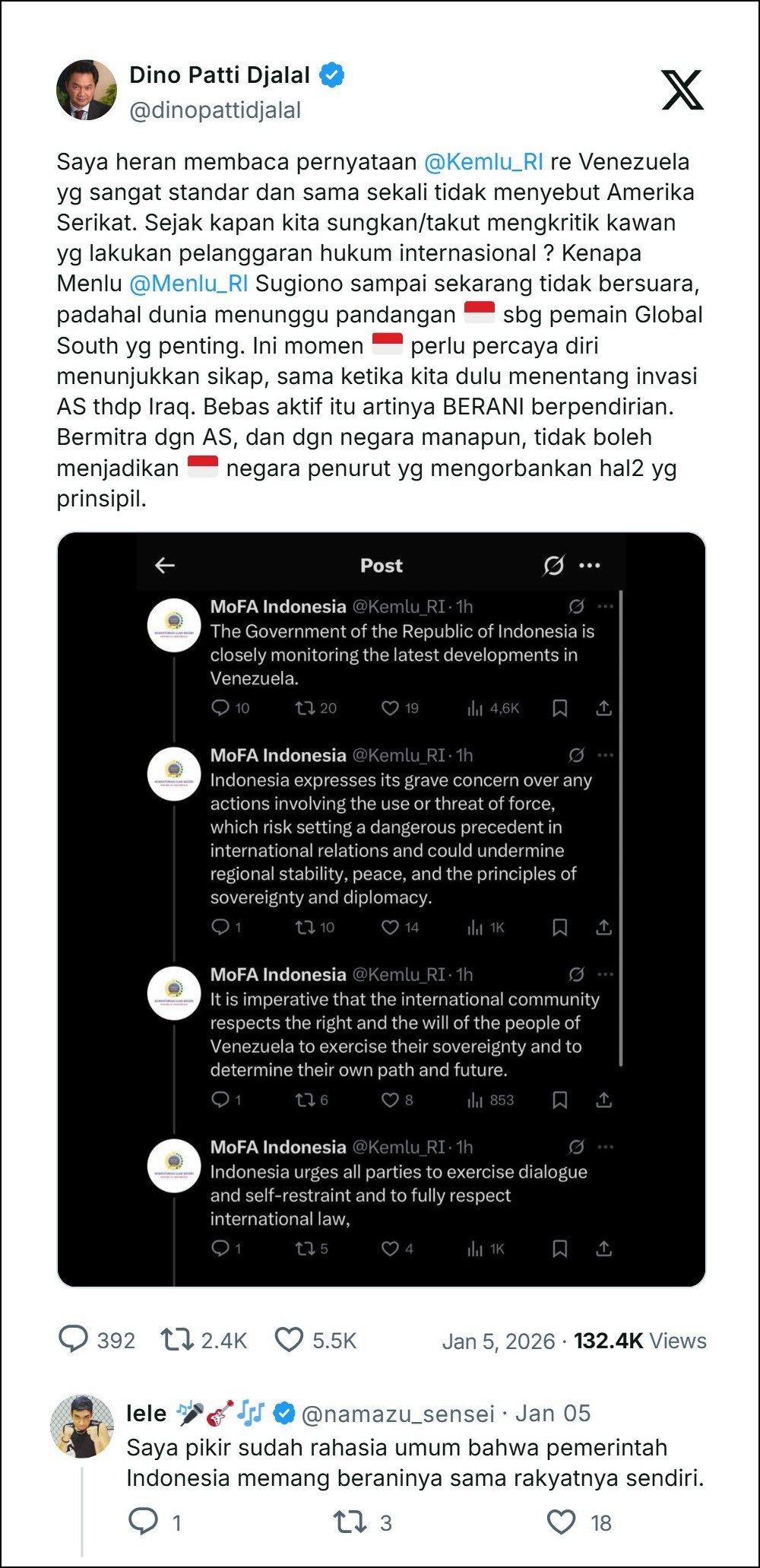 Bahkan mantan Wakil Menteri Luar Negeri Indonesia era Presiden SBY, Dr. Dino Patti Djalal turut menanggapi pernyataan resmi Kementerian Luar Negeri RI terkait serangan AS terhadap Venezuela.
