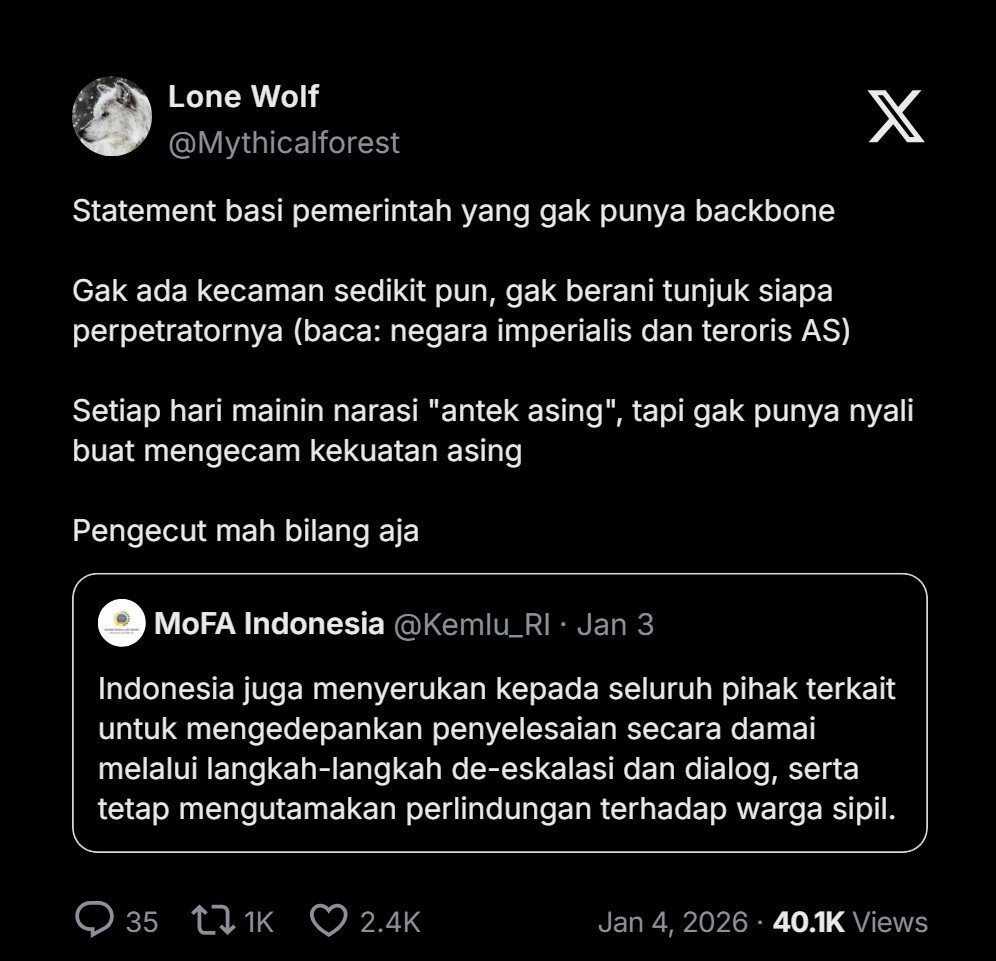 SIKAP DAN PERNYATAAN INDONESIA YANG DISAMPAIKAN KEMENTERIAN LUAR NEGERI RI TERKAIT SERANGAN AS TERHADAP VENEZUELA mendapat kecaman publik karena dinilai PENGECUT tidak berani mengecam AS bahkan menyebut “AS” saja tidak berani.
