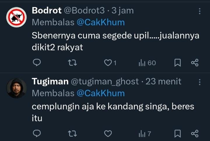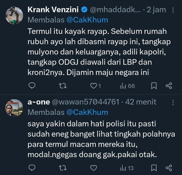 “Termul itu kayak rayap. Sebelum rumah rubuh ayo lah dibasmi rayap ini, tangkap mulyono dan keluarganya, adili kapolri, tangkap ODGJ diawali dari LBP dan kroni2nya. Dijamin maju negara ini,” komen netizen akun X @mhaddadksa.